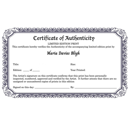 All prints are Signed by the Artist, numbered as one of only 200 prints worldwide and each comes with a Signed Numbered Certificate of Authenticity on Parchment Paper in a clear cellophane pouch.